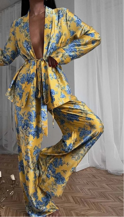 Yellow Print Womens 2 Piece Outfit Set Casual Satin Long Sleeve Lace-Up Shirts