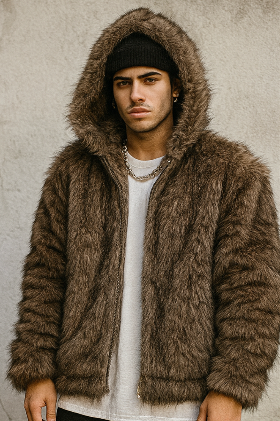Giubbotto in ecopelliccia marrone con cappuccio